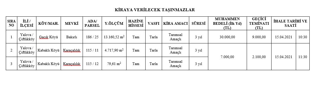 1) Aşağıdaki tablonun 1, 2 ve 3. Sırasında bulunan taşınmazlar, hizalarında belirtilen tarih ve saatte 2886 sayılı Devlet İhale Kanununun 51/g maddesine göre “Pazarlık Usulü” ile Hazine Taşınmazlarının İdaresi Hakkında Yönetmeliğin 67’nci maddesinin 4’ncü fıkrasının (a) bendi gereğince tarımsal amaçlı olarak kullanılmak üzere 3 (üç) yıllığına kiraya verilecektir.