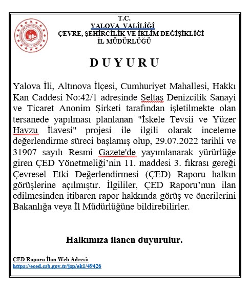 Yalova İli, Altınova İlçesi, Cumhuriyet Mahallesi, Hakkı Kan Caddesi No:42/1 adresinde Seltaş Denizcilik Sanayi ve Ticaret Anonim Şirketi tarafından işletilmekte olan tersanede yapılması planlanan "İskele Tevsii ve Yüzer Havzu İlavesi" projesi ile ilgili olarak inceleme değerlendirme süreci başlamış olup, 29.07.2022 tarihli ve 31907 sayılı Resmi Gazete'de yayımlanarak yürürlüğe giren ÇED Yönetmeliği’nin 11. maddesi 3. fıkrası gereği Çevresel Etki Değerlendirmesi (ÇED) Raporu halkın görüşlerine açılmıştır. İlgililer, ÇED Raporu’nun ilan edilmesinden itibaren rapor hakkında görüş ve önerilerini Bakanlığa veya İl Müdürlüğüne bildirebilirler.